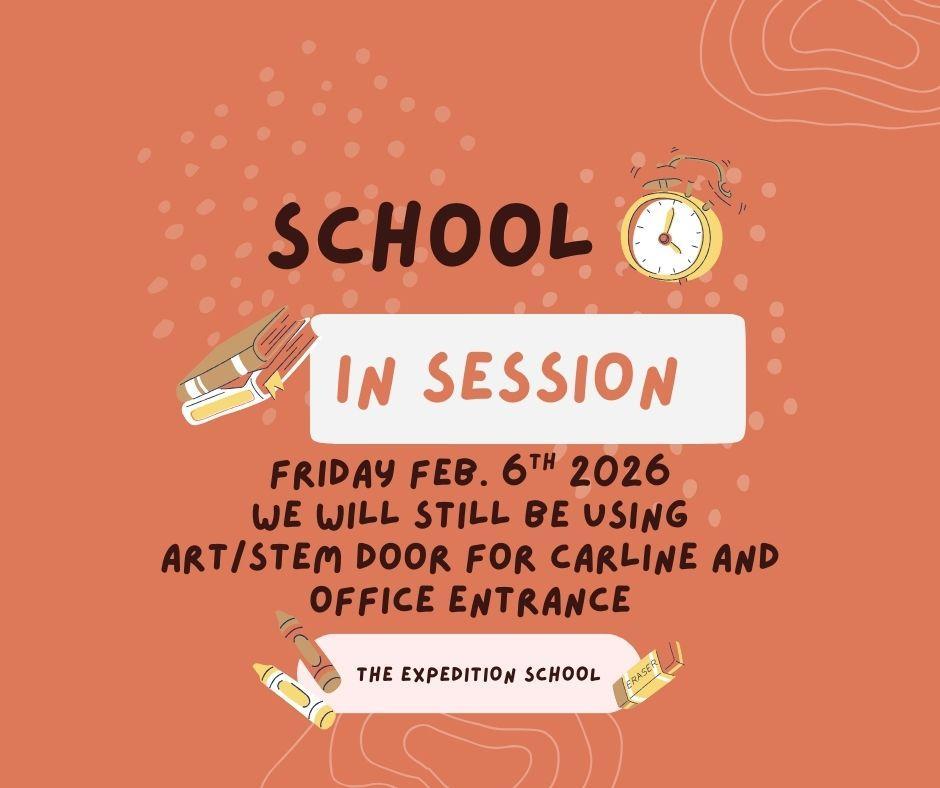 On Friday February 6th, 2026, The Expedition School will operate on regular school day!!! Students can begin entering the school at 7:35 and carline will run until 8:15am. Tardies will not be counted until 8:15am. We will use the same process as Wednesday for school entry.